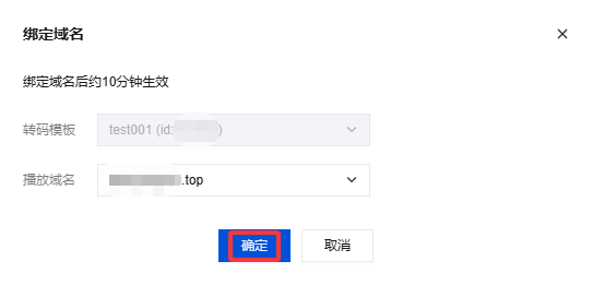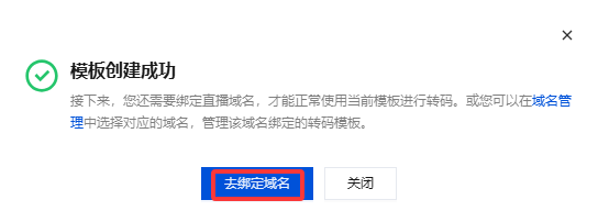 新转码模板创建成功后关联域名:设置转码模板 成功后,单击提醒框中的去绑定域名。 3. 在域名绑定窗口中,选择您需绑定的转码模板及播放域名(可同时绑定多个播放域名),单击确定即可绑定成功。