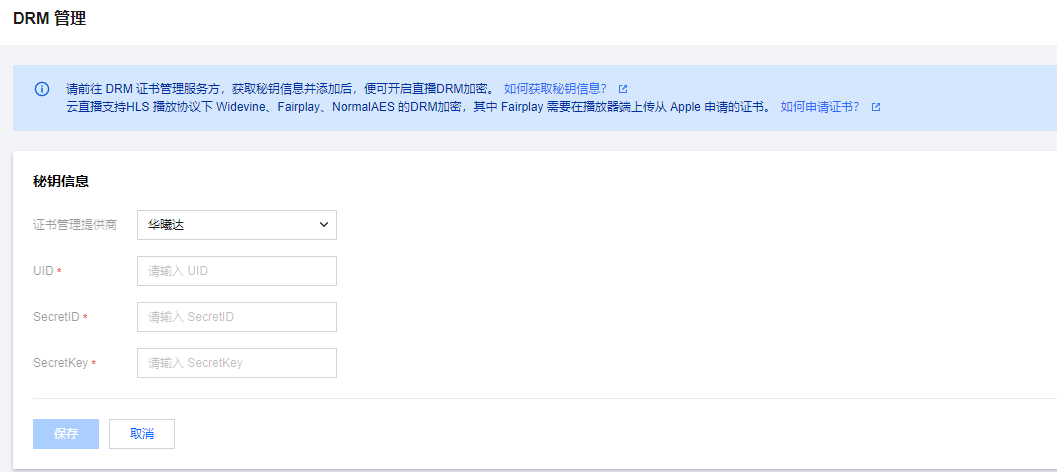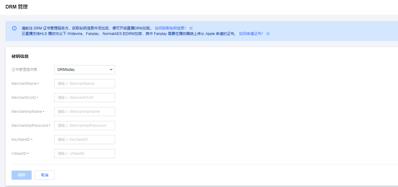3. 填写密钥信息,选择证书管理提供商,可选择华曦达或 DRMtoday,具体配置如下: