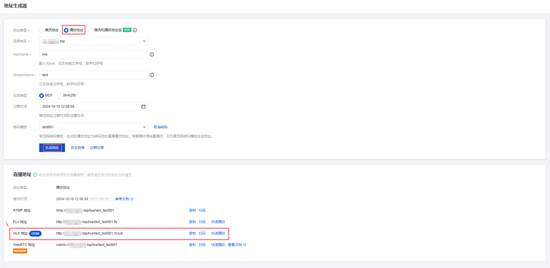 使用 DRM 加密要求播放地址必须是 HLS 播放协议,您可前往 地址生成器 选择对应的转码模板,生成播放地址,选择 HLS 播放协议的地址作为 DRM 播放地址。 配置播放器