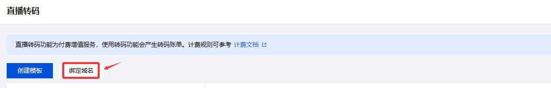 1. 登录云直播控制台,进入功能配置 > 直播转码。 2. 通过以下方式进入域名绑定窗口: