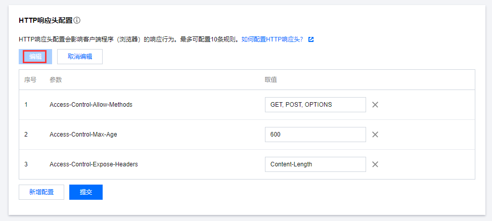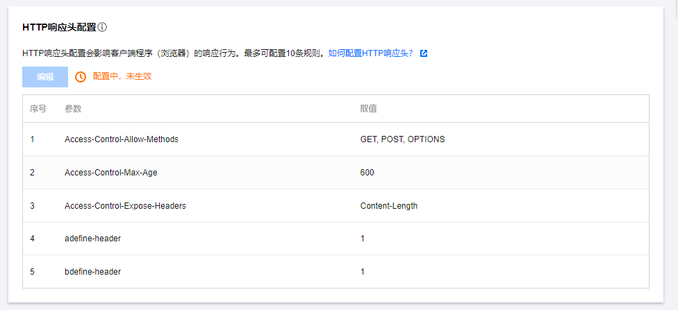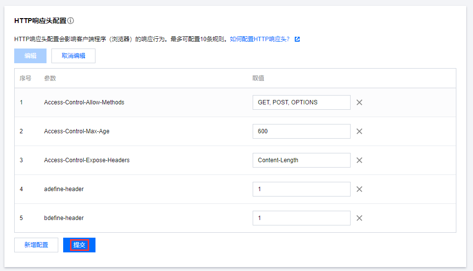 Access-Control-Allow-Origin,用于实现允许跨域请求,无需自定义。具体分为两种情况:'Access-Control-Allow-Origin: *'。'Origin: ${Origin}',返回的 header 会返回 'Access-Control-Allow-Origin: ${Origin}',比如当请求 header 带 Origin: https://cloud.tencent.com 时,则返回 Access-Control-Allow-Origin: https://cloud.tencent.com 。