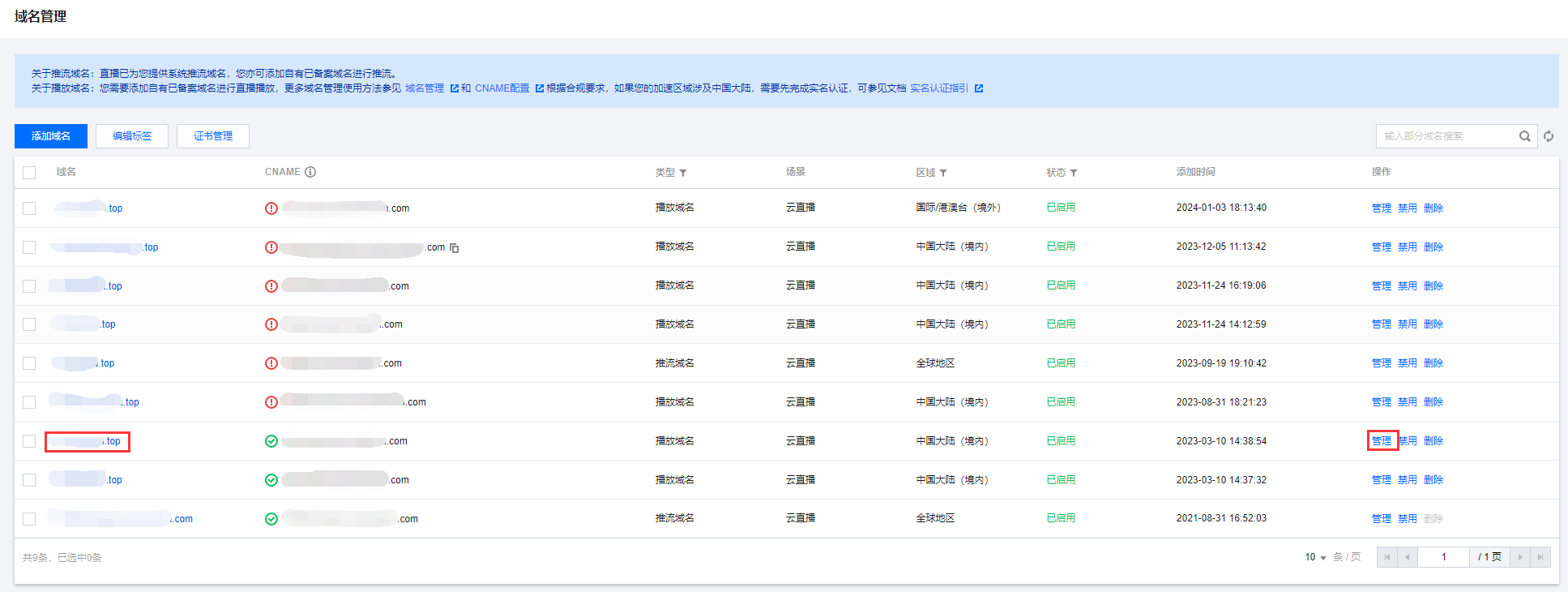 1. 选择 域名管理,单击需要 RTMP 及 FLV 延迟配置的播放域名或右侧的管理,进入域名管理页。 2. 在 高级配置 > 延迟配置中,可对 RTMP 及 FLV 进行延迟配置。