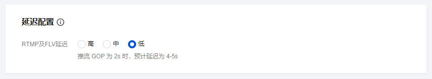 3. 在进行直播延迟参数配置时,建议您根据实际业务需求,选择合适的延迟参数。建议您将推流 GOP 设置为1s - 2s,因为GOP 值越大,直播延迟也会越大。低延迟配置可能会带来直播卡顿的问题。