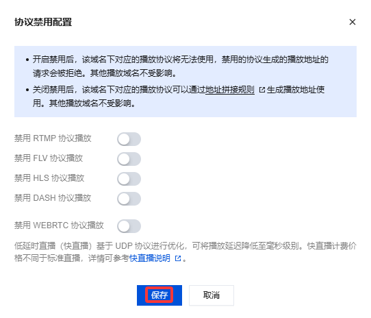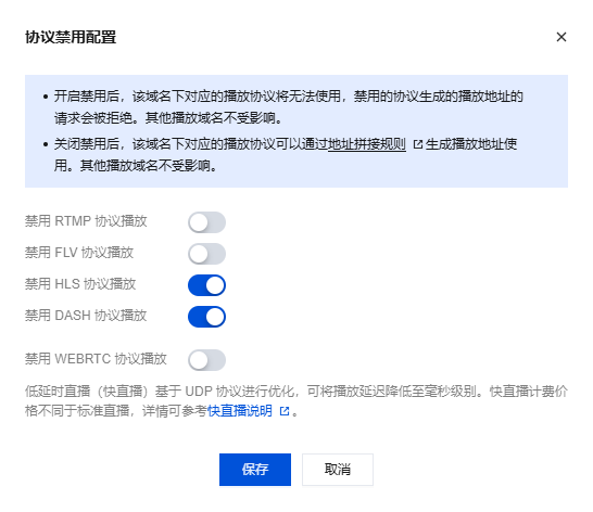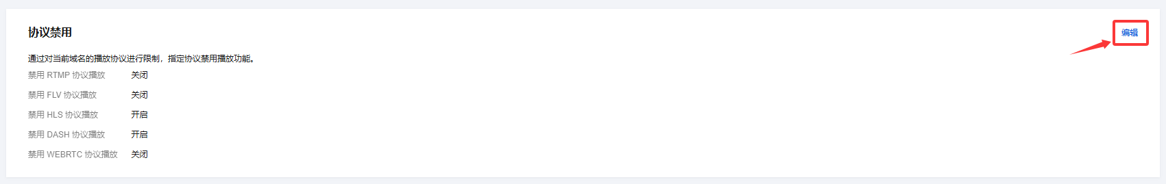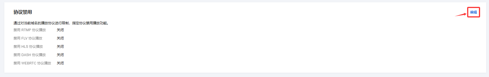 通过对当前域名的播放协议进行限制,开启禁用后,该域名下对应的播放协议将无法使用,禁用协议生成的播放地址请求会被拒绝。