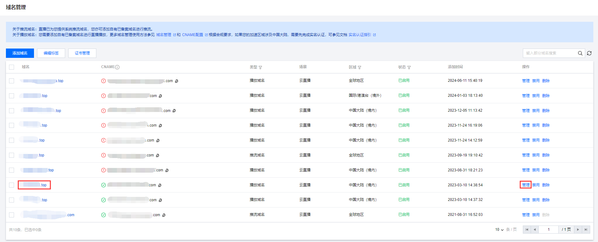 1. 选择 域名管理,单击需关闭协议禁用的播放域名或右侧的管理,进入域名管理页。 2. 在访问控制 > 协议禁用中,单击编辑 ,在协议禁用配置中对指定协议关闭协议禁用按钮。