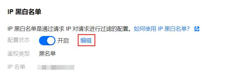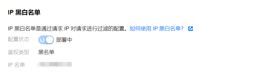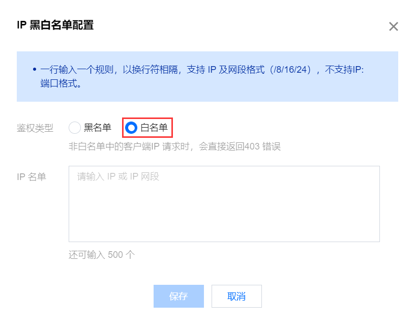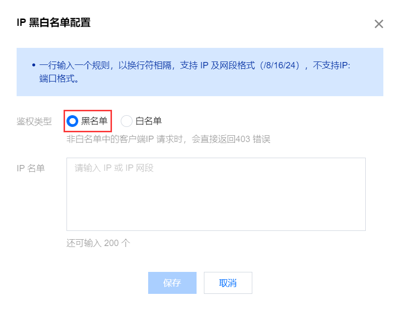 IP 名单 | IP 黑名单最多支持配置 200 条规则, IP 白名单最多支持配置 500 条规则。请使用换行符分隔。 支持 IP 及网段格式(/8/16/24),不支持 IP:端口格式。 暂不支持 IPv6。 |
