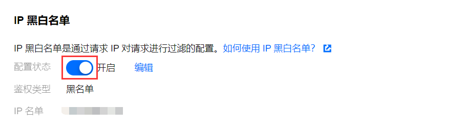 2. 在高级配置 > IP 黑白名单配置中,单击,选择关闭 IP 黑白名单。