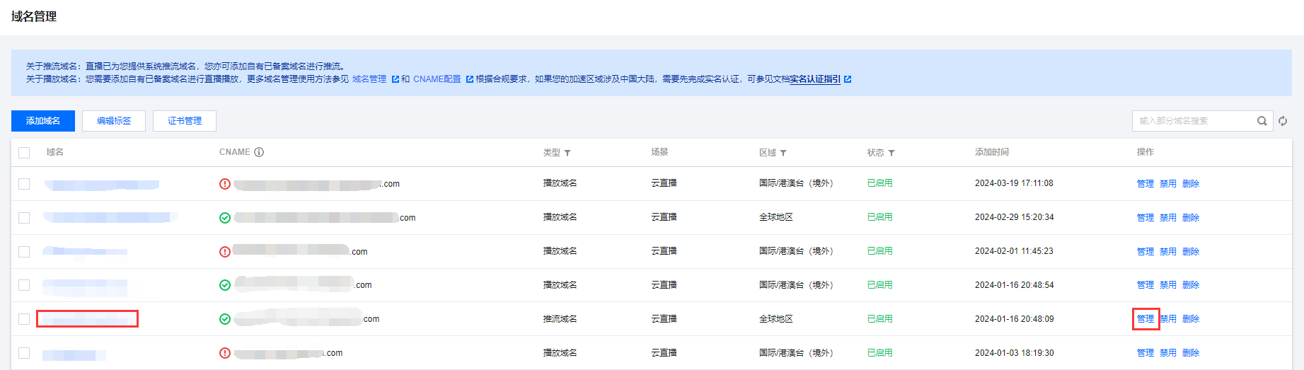 1. 选择 域名管理,单击需关闭 IP 黑白名单配置的推流域名或右侧的管理,进入域名管理页。