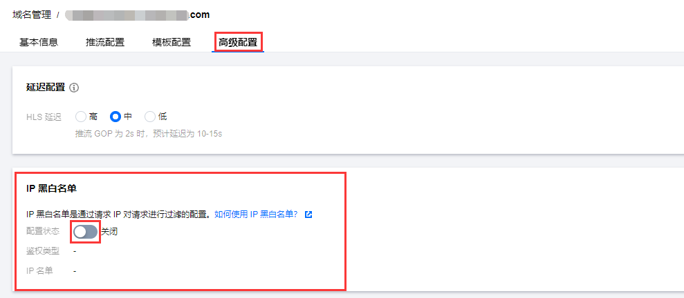 1. 选择 域名管理,单击需要配置 IP 黑名单的推流域名或右侧的管理,进入域名管理页。 2. 在高级配置 > IP 黑名单配置中,单击开启 IP 黑白名单。 3. 开启 IP 黑白名单后,进入 IP 黑白名单配置页,并进行如下配置: