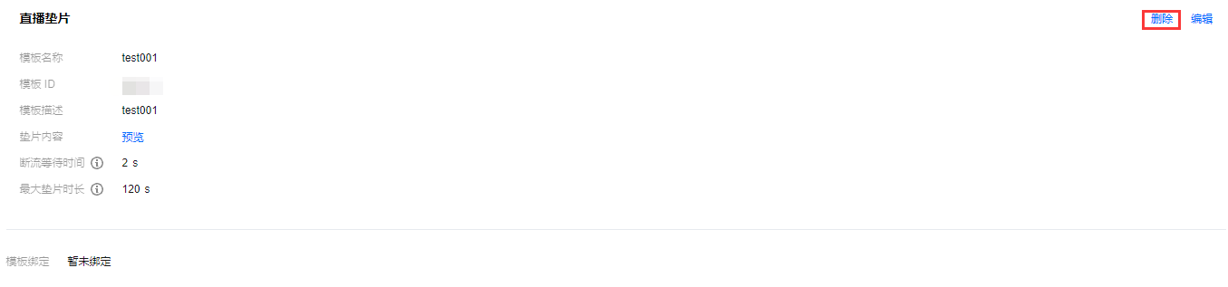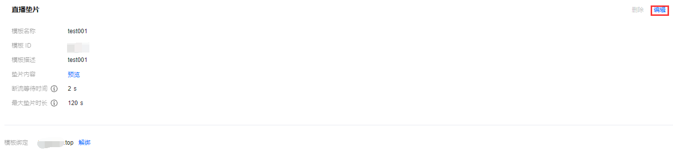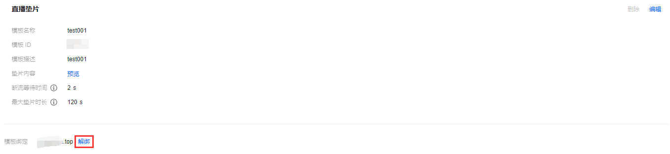 1. 登录云直播控制台,进入功能配置 > 直播垫片。 2. 选择已关联域名的垫片模板,单击解绑。
