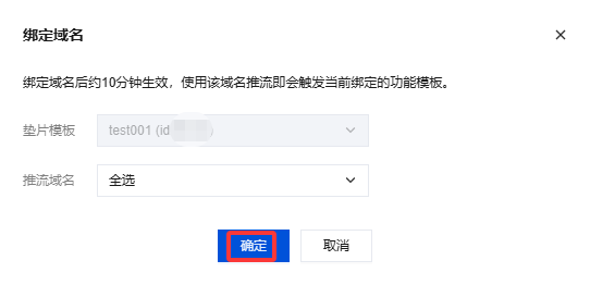 3. 在域名绑定窗口中,选择您需绑定的垫片模板及推流域名(可同时绑定多个推流域名),单击确定即可绑定成功。