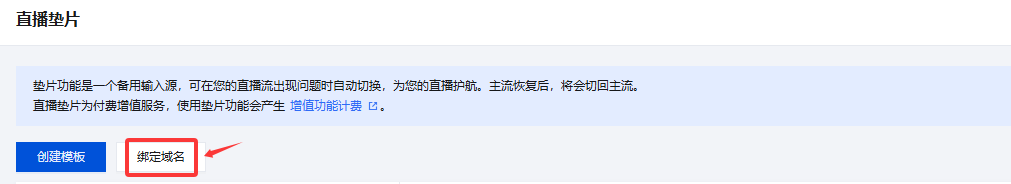 1. 登录云直播控制台,进入功能配置 > 直播垫片。 2. 通过以下方式进入域名绑定窗口。