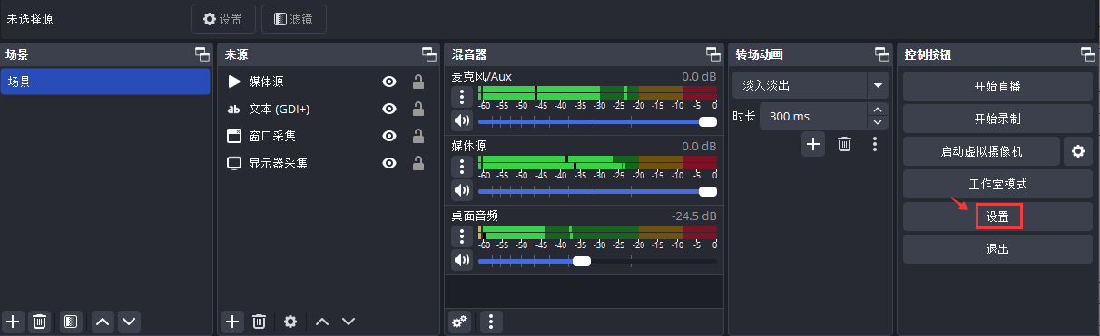 2.1 打开 OBS,您可通过底部工具栏的控件 > 设置进入设置界面。