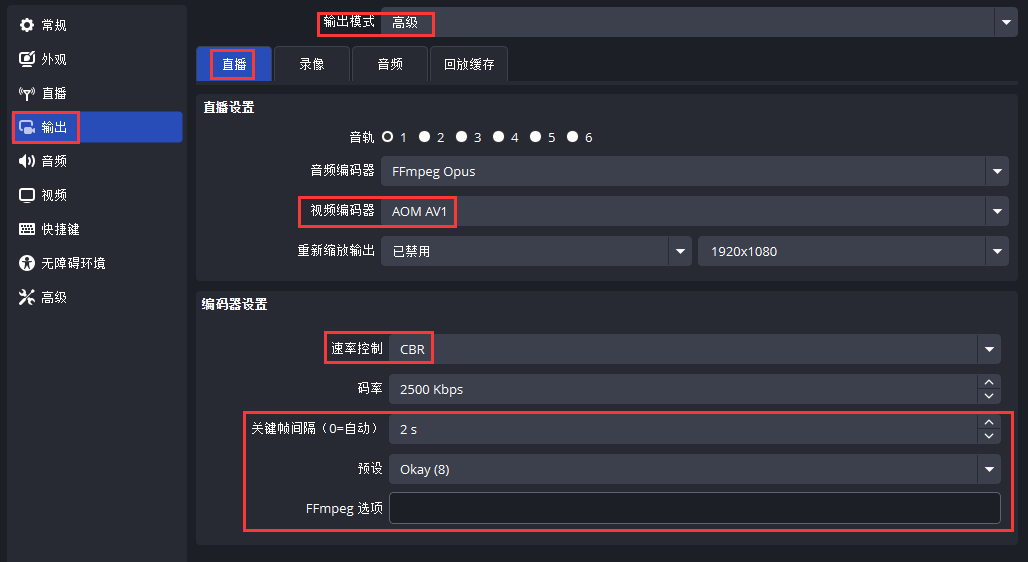 1. 通过控件 > 设置 > 输出。进入推流参数设置界面,选择输出模式为高级。