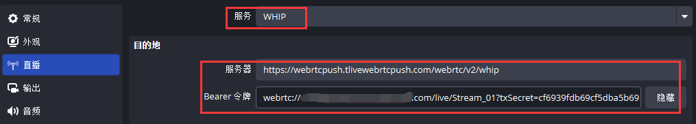 在服务器中填写腾讯云直播 WHIP 服务器地址: