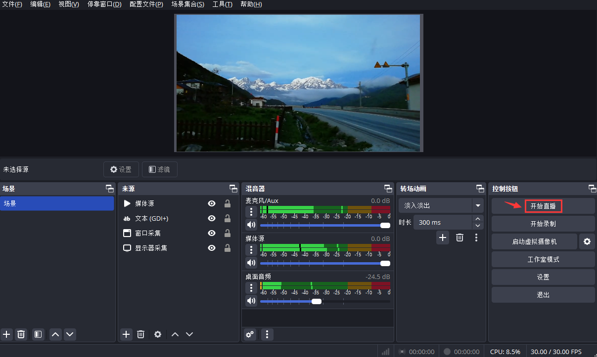 单击 OBS 底部工具栏中的控制 > 开始直播即可将媒体流推送到您设置的 WebRTC 地址。