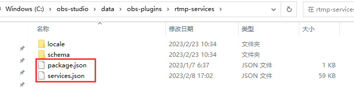 1.1 下载 OBS 插件,根据本地 OBS 版本,把对应版本内 data 文件里面的两个 services.json 和 package.json 文件,挪动到对应的 data > obs-plugins > rtmp-services 目录进行覆盖。(obs-studio 默认安装在 C 盘,对应的目录为:C:\\obs-studio\\data\\obs-plugins\\rtmp-services,请根据您的实际情况进行配置。)