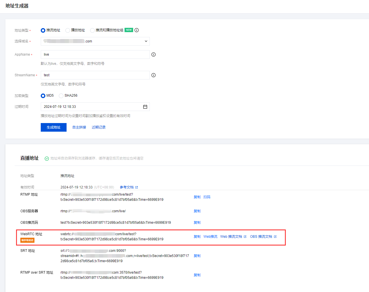 2. 单击生成地址即可获取 WebRTC 推流地址。