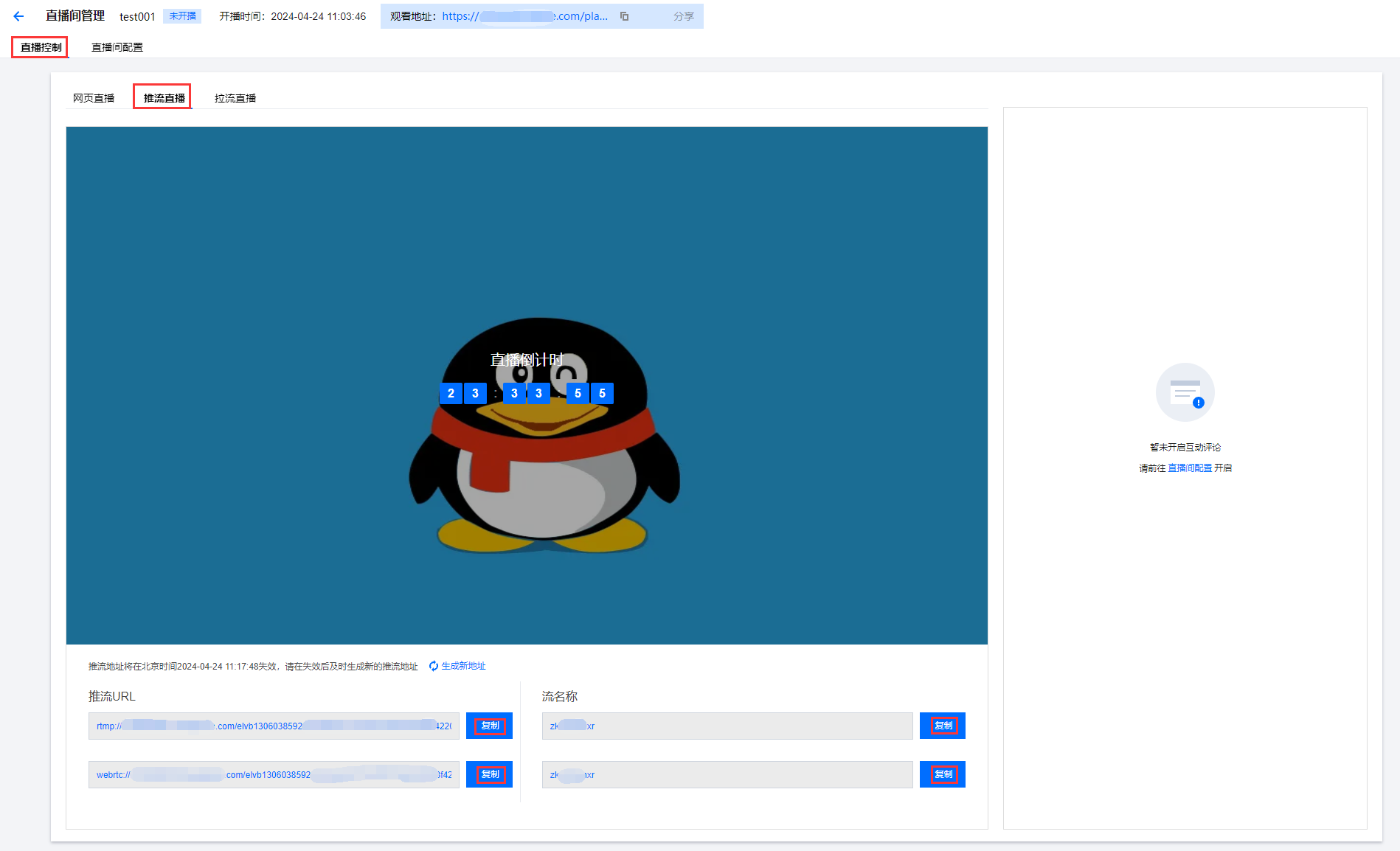 1. 默认情况下,系统会生成推流URL和流名称信息,支持复制到第三方推流工具上进行直播,例如 OBS。