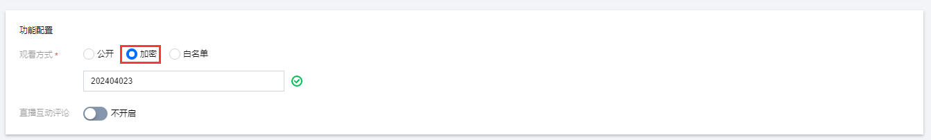 当观看方式选择加密时,需要填写直播观看密码,其长度应为8-14个字符,并且不允许包含空格、中文及特殊符号。