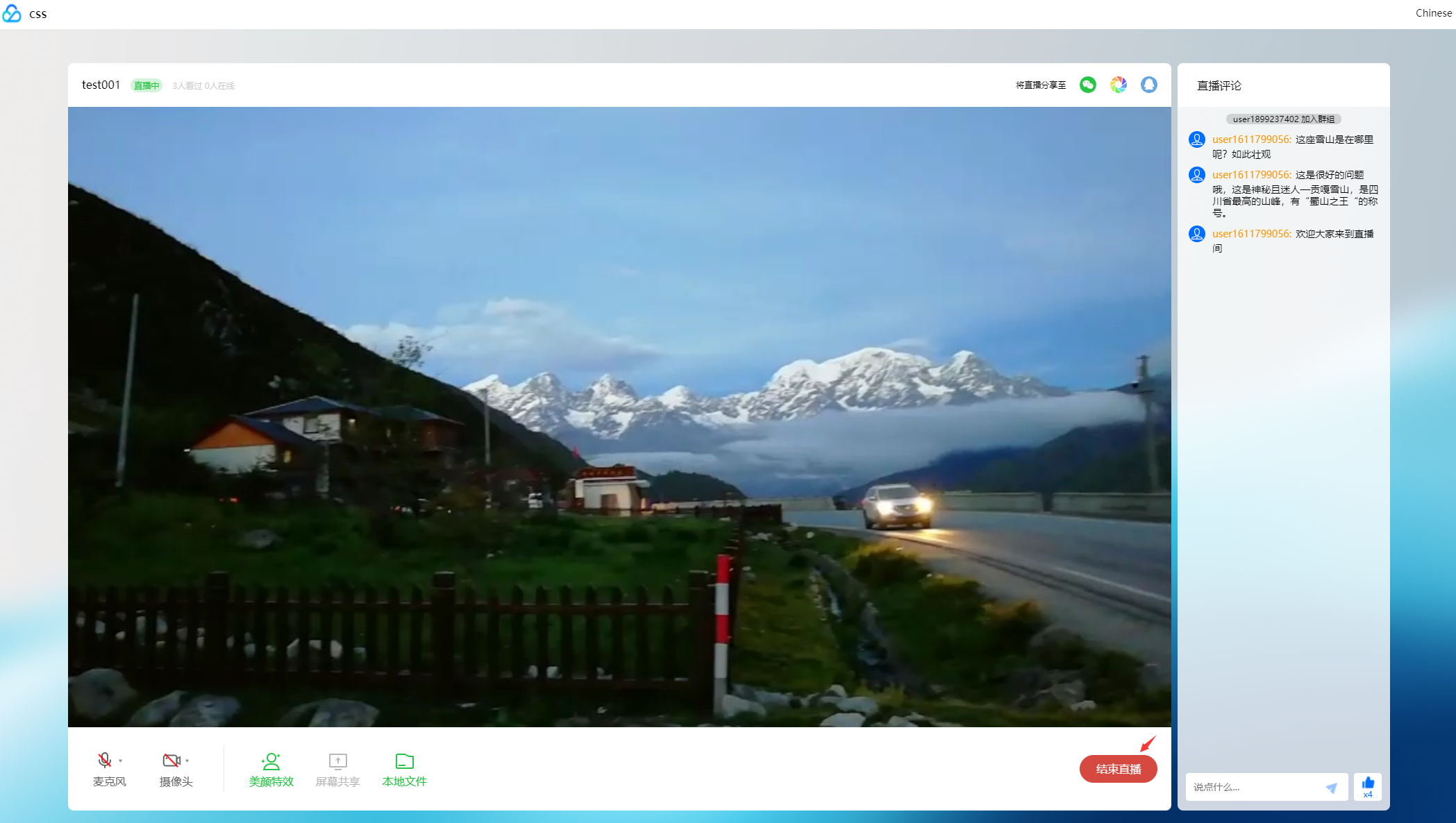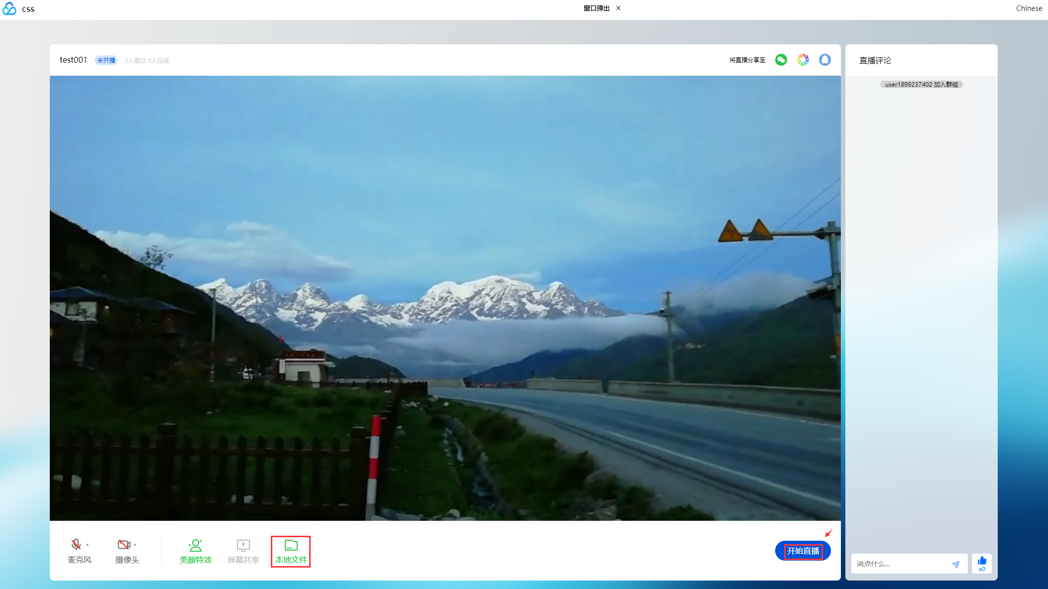 2. 可以通过摄像头、屏幕共享或本地文件等方式进行直播。单击开始直播按钮后,系统将开始推流。以本地文件方式上传视频进行直播举例: