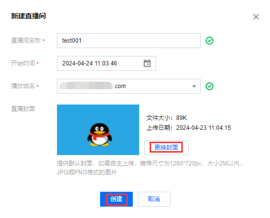 6. 直播封面,默认封面,如需自主上传,单击更换封面,推荐尺寸为1280*720px,大小2M以内,JPG 或 PNG 格式的图片。