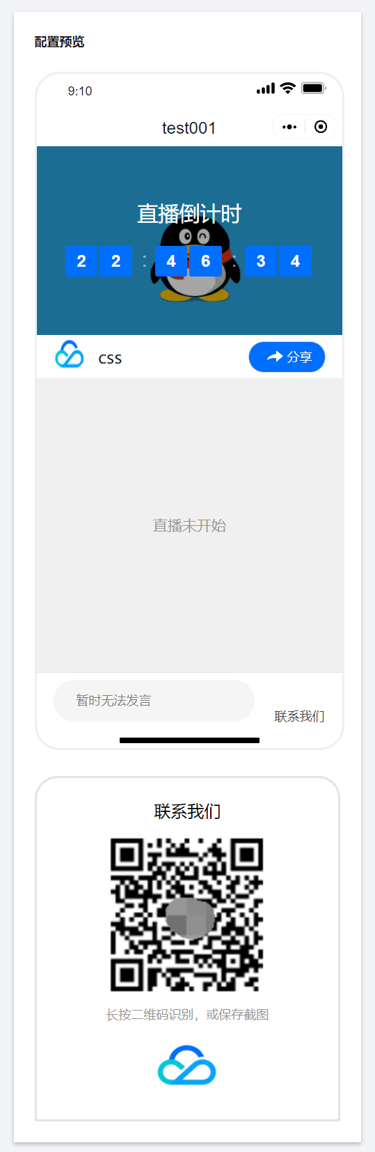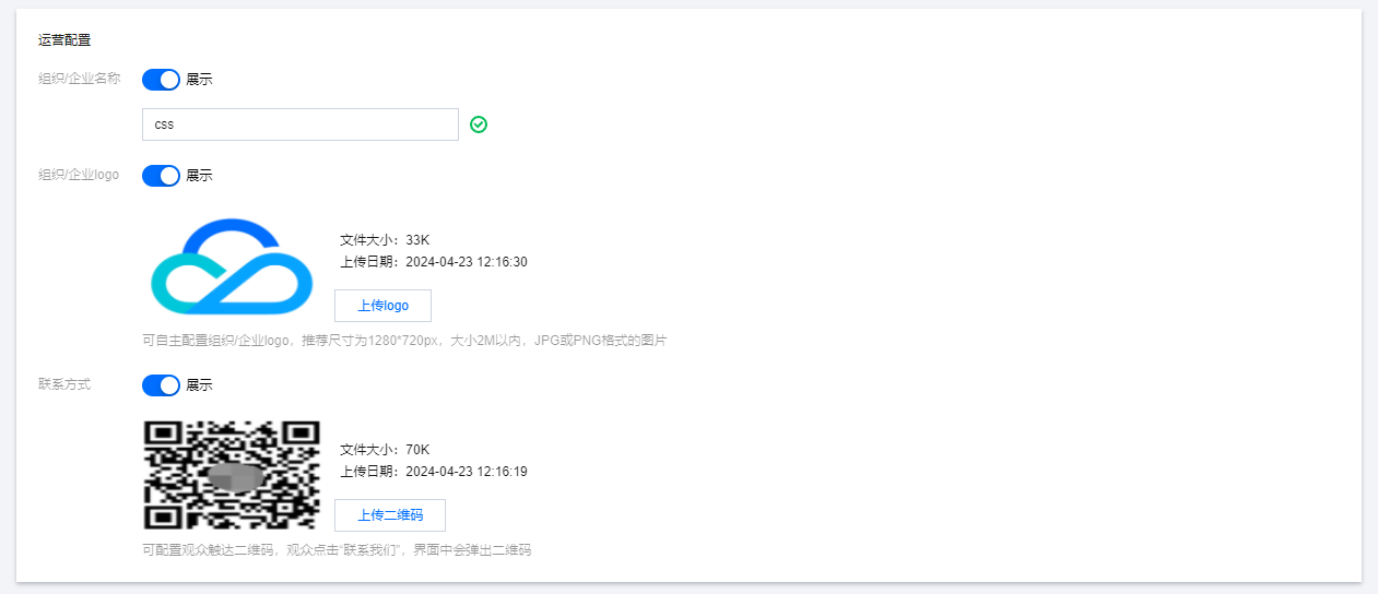 联系方式:单击上传二维码,您可以配置观众触达二维码。当观众点击“联系我们”时,界面将弹出该二维码。