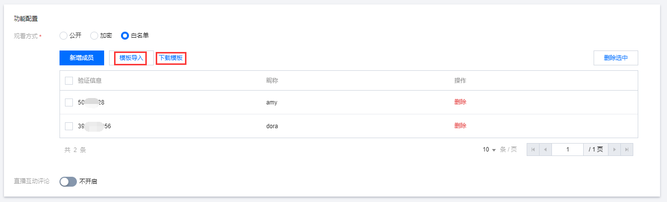 单击模板导入,支持导入 CSV 和 Excel 类型的文件,快捷增加可观看直播的用户名单。