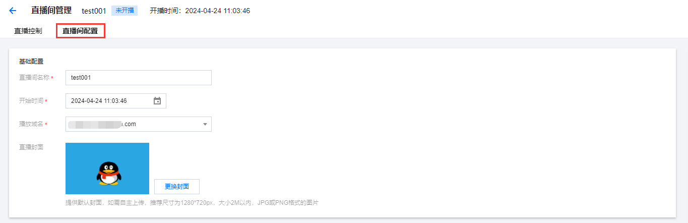 登录云直播控制台,进入直播工具箱 > 选择 无忧直播 > 直播间管理 > 直播间配置。 在完成 基础配置 后,您可以对基础配置内容(包括直播间名称、开始时间、播放域名和直播封面)进行调整和修改。 功能配置