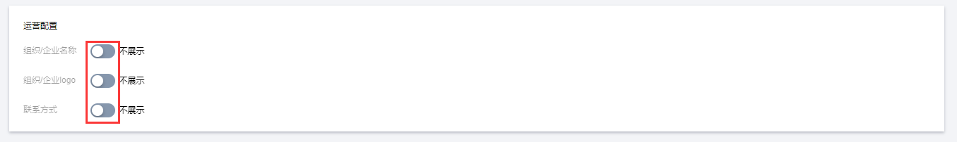 运营配置的信息默认关闭,根据您的实际业务需求,可单击开启。 组织/企业名称:请填写组织或企业名称,字符数不得超过60个。