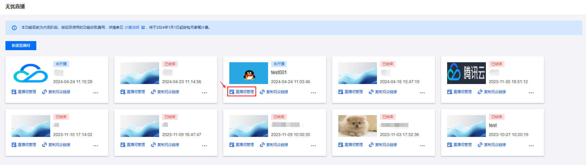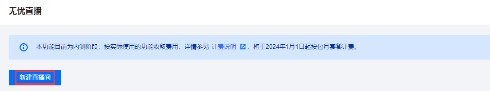本功能目前为内测阶段,按实际使用的功能收取费用,详情参见 计费说明,将于2024年1月1日起按包月套餐计费。 直播间管理(管理侧)