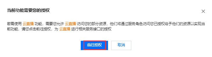 3. 控制台会弹窗申请资源授权,请单击弹出窗口的前往授权,进入角色管理页面。