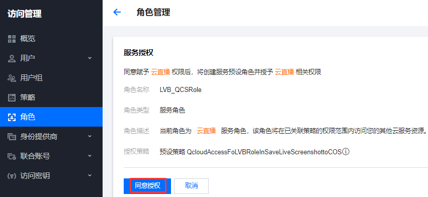 4. 在角色管理页面,单击同意授权,完成身份校验后即可完成 COS 资源授权,正常使用直播审核服务。