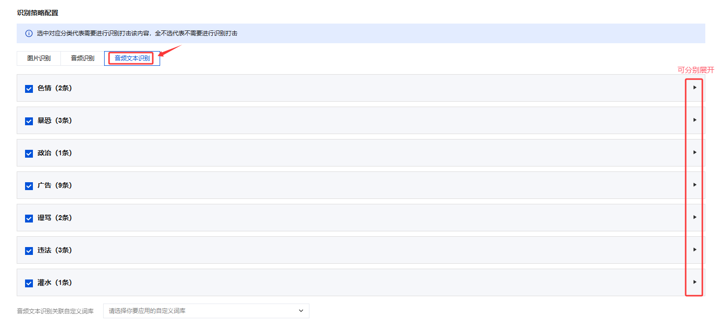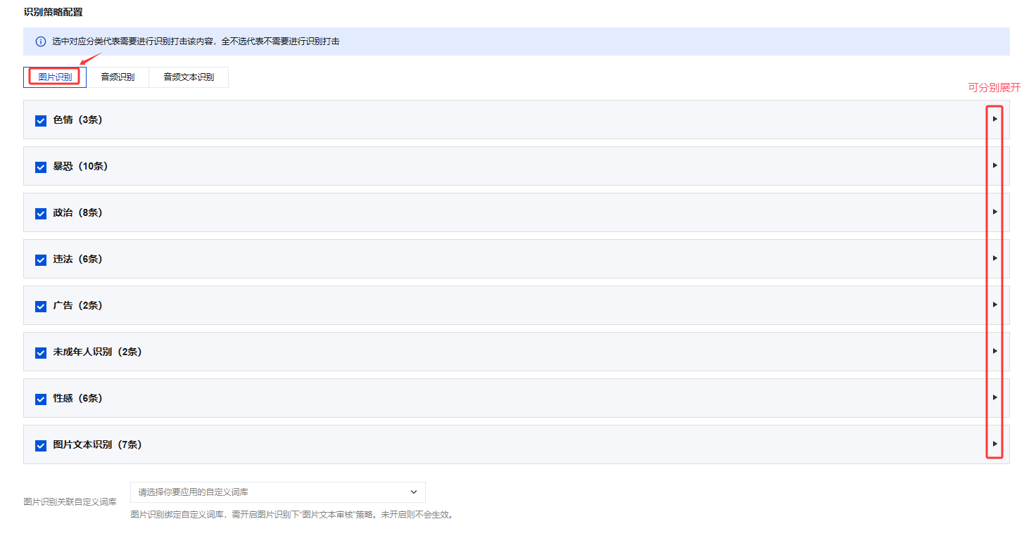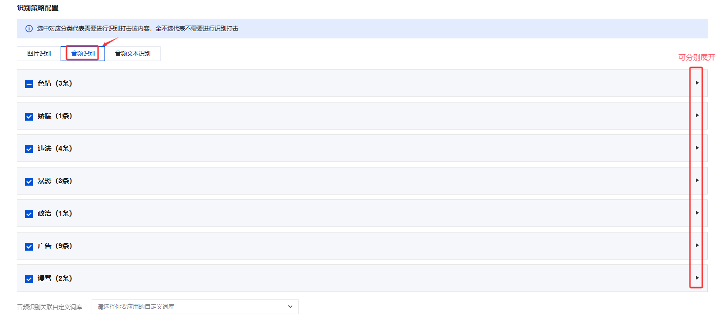2. 识别策略配置中图片识别、音频识别和音频文本识别可分别展开,勾选您需要的识别审核的维度。