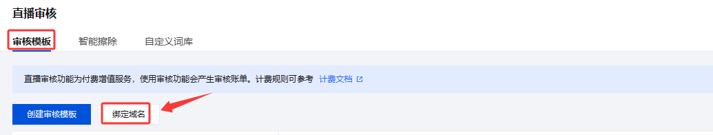 1. 登录 云直播控制台, 在左侧导航栏中,选择功能配置 > 直播审核。 2. 通过以下方式进入域名绑定窗口: