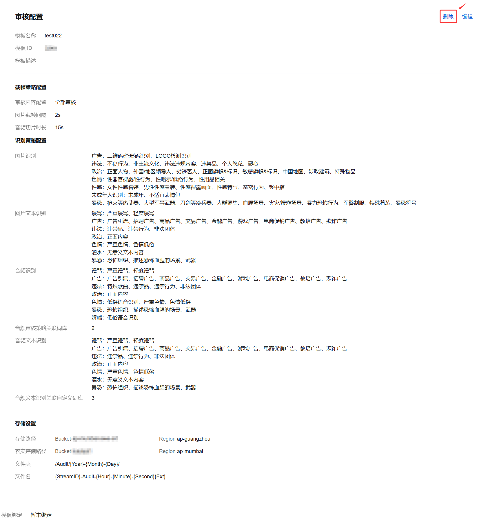 1. 在识别策略配置页面,可根据您的不同业务场景需求,进行图片识别、音频识别和音频文本识别的策略配置。