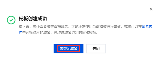 新审核模板创建成功后关联域名:审核模板创建成功后,单击提醒框中的去绑定域名。