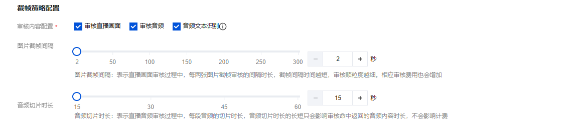 审核内容配置 | 是 | 审核直播画面 图片截帧间隔:表示直播画面审核过程中,每两张图片截帧审核的间隔时长,截帧间隔时间越短,审核颗粒度越细。相应审核费用也会增加。 图片截帧间隔,取值2 - 300s,默认2s。 审核音频 音频审核功能仅支持中文。 音频切片时长:表示直播音频审核过程中,每段音频的切片时长,音频切片时长的长短只会影响审核命中返回的音频内容时长,不会影响计费。 音频切片时长,取值15 - 60s,默认15s。 音频文本识别 音频文本识别仅用于 智能擦除 等场景,不会触发审核。智能擦除功能使用其配置的策略识别并擦除违规音频内容。 |
