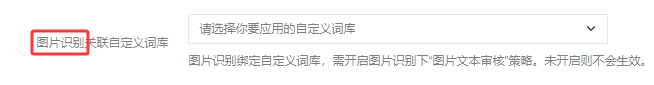 图片识别绑定自定义词库,需开启图片识别下“图片文本审核”策略。未开启则不会生效。