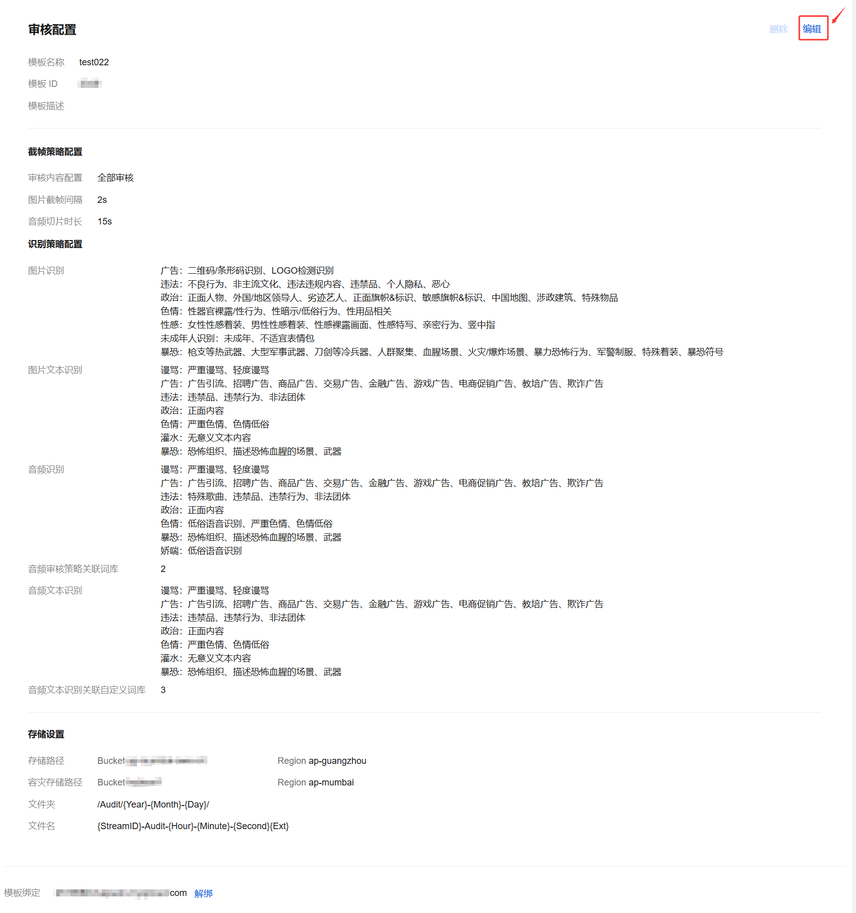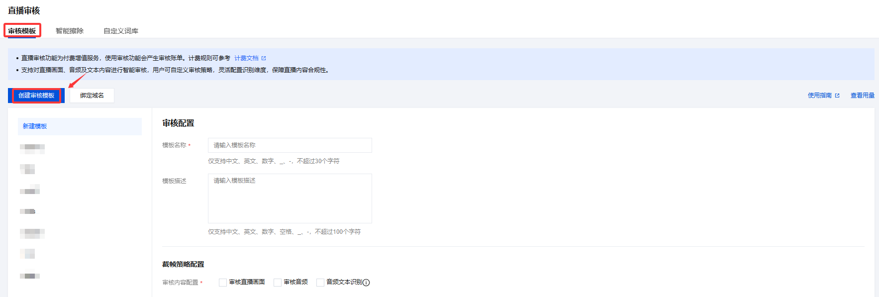 模板创建成功后,可与推流域名进行关联,相关文档可参见直播审核配置,模板关联成功后约5分钟-10分钟生效。