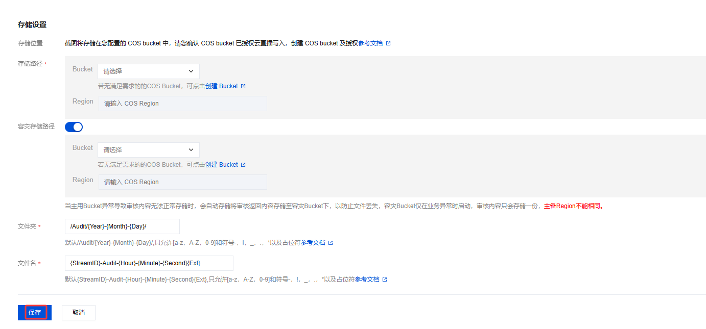 容灾存储路径 | 否 | 可开启容灾存储路径,当主用 Bucket 异常导致审核内容无法正常存储时,会自动将审核返回内容存储至容灾 Bucket 下,以防止文件丢失,容灾 Bucket 仅在业务异常时启用,审核内容只会存储一份,主备 Region 不能相同。 |