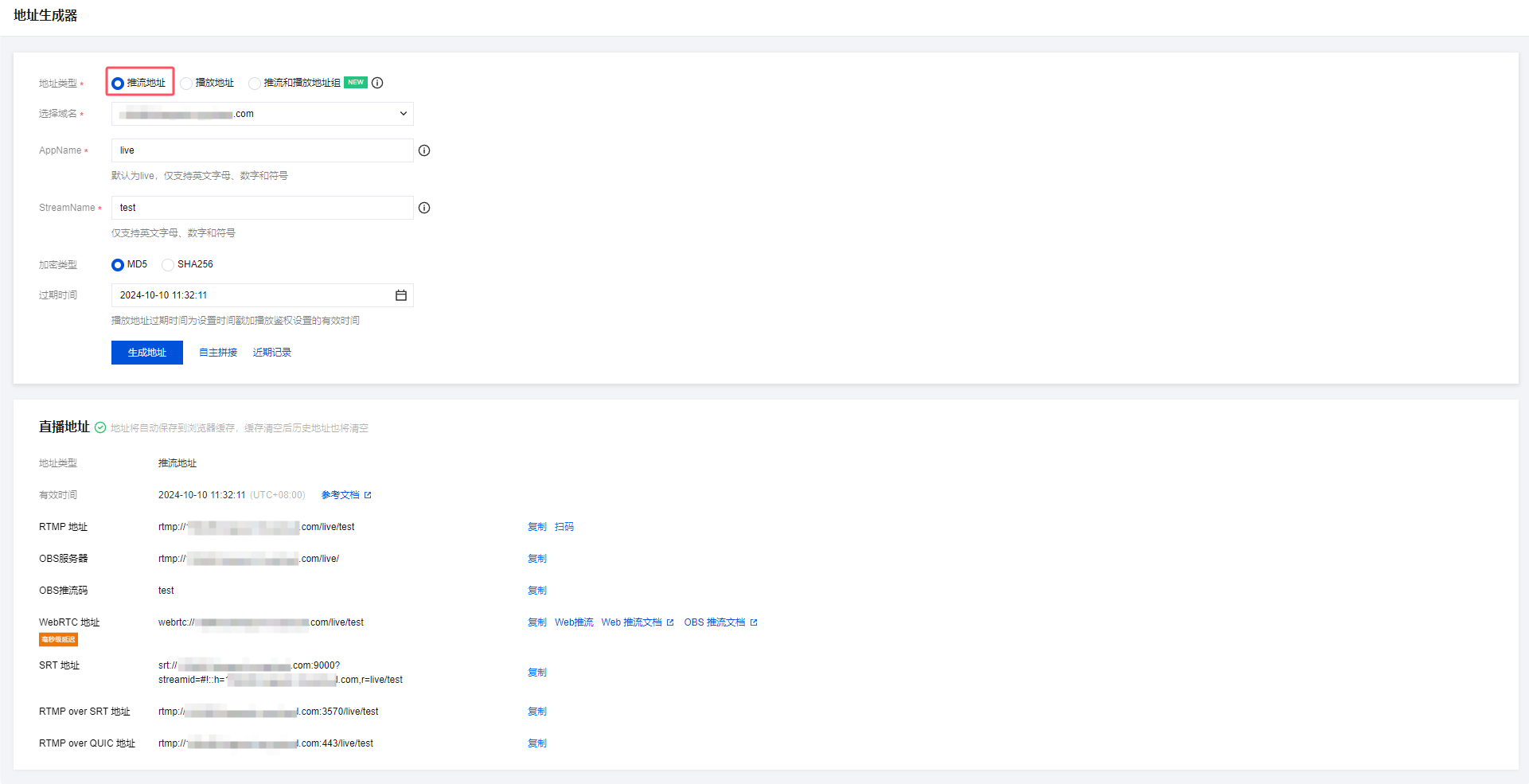 进入云直播控制台的常用工具 > 地址生成器,选择地址类型:推流地址,并按需选择推流域名,详细操作请参见地址生成器文档 > 生成推流地址。 2. 将生成的 RTMP 推流地址修改成 RTMPS 输入到 OBS 开始 RTMPS 推流,详细操作请参见 OBS 推流。 直播拉流
