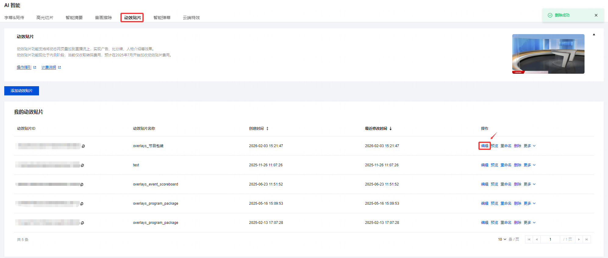 1. 登录 云直播控制台,进入功能配置 > AI 智能 > 动效贴片。 2. 在贴片列表中,根据您的业务需求选择您想要编辑的动效贴片,单击编辑。