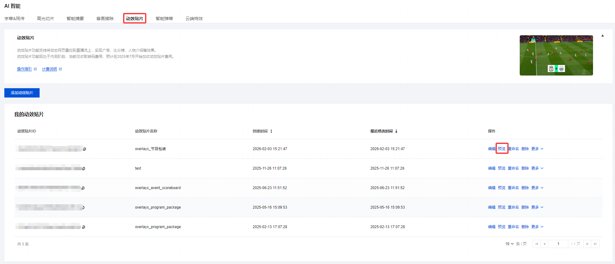 1. 登录 云直播控制台,进入功能配置 >AI 智能 > 动效贴片。 2. 在贴片列表中,根据您的业务需求选择想要预览的动效贴片,单击预览,即可打开实时预览窗口。