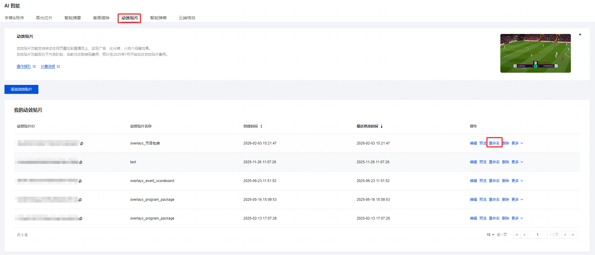 1. 登录 云直播控制台,进入功能配置 > AI 智能 > 动效贴片。 2. 在贴片列表中,根据您的业务需求选择相应的动效贴片,单击重命名。