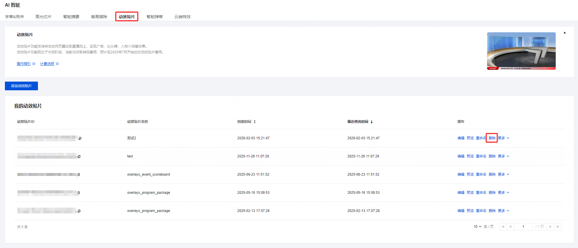 1. 登录 云直播控制台,进入功能配置 > AI 智能 > 动效贴片。 2. 在贴片列表中,根据您的业务需求选择要删除的动效贴片,单击删除。