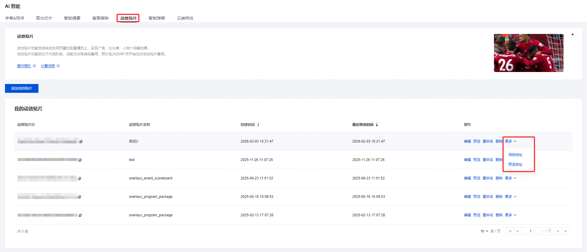 1. 登录 云直播控制台,进入功能配置 > AI 智能 > 动效贴片。 2. 在贴片列表中,根据您的业务需求选择相应的动效贴片,单击更多展开以复制场控地址和预览地址。