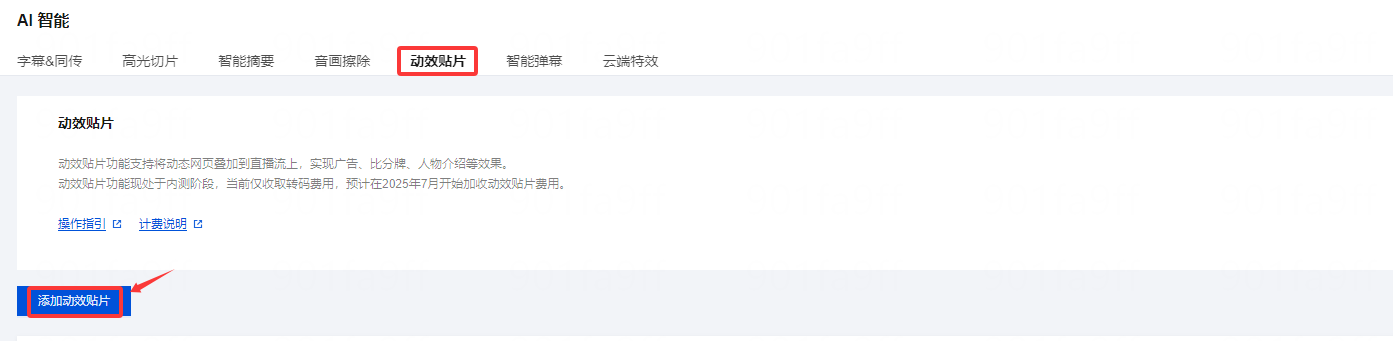 1. 登录 云直播控制台,进入功能配置 > AI 智能 > 动效贴片。 2. 单击添加动效贴片,进入添加窗口。