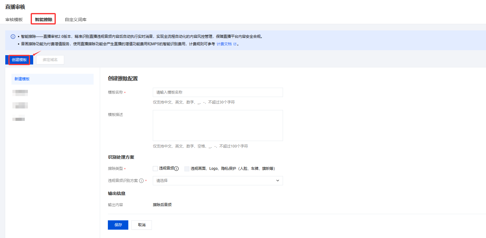 云直播提供智能擦除功能,可通过控制台配置智能擦除模板。推流域名关联模板后,在推流过程中获取音频,识别其中的违规内容并进行消音处理,有效维护直播间的良好环境。本文将向您介绍如何通过控制台创建、绑定、解绑、修改及删除智能擦除模板。