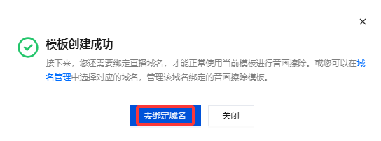 新智能擦除模板创建成功后关联域名:智能擦除模板创建成功后,单击提醒框中的去绑定域名。